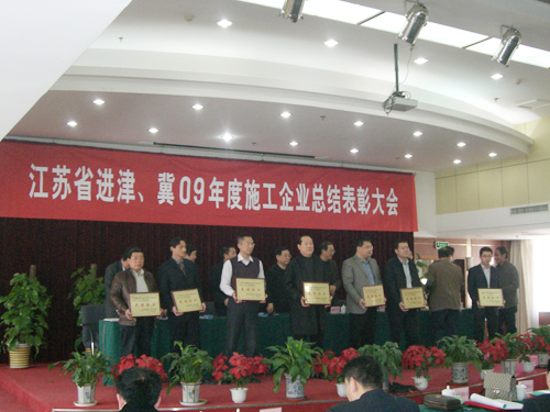 三月二十七日,江蘇省建設廳、江蘇省建筑工程管理局駐津辦在天津隆重召開了進津、冀09年施工企業總結表彰大會,出席大會的主要領導有江蘇省建設廳副廳長徐學軍、天津市建筑業協會郭俊杰會長、天津市建交委趙敏處長、質安總隊總長翟家常、施管站周國慶站長、江蘇省建設廳駐津辦主任鄧福林等。大會對2009年度江蘇省進津、冀建筑施工先進企業、優秀項目部、優秀建造師和施工管理先進工作者進行了表彰和頒獎,天津、石家莊分公司雙雙被授予“2009年度江蘇進津、冀施工管理先進企業”,這也是兩分公司連續三年獲此榮譽。 此外,天津君臨大廈項目部、唐山金港國際怡園小區項目部、石家莊水岸美景小區項目部被授予優秀項目部,陳正進、張維琪、生加旺、朱玉平4位同志被評為優秀項目經理,陳元國、江慶華、馬和平等13位同志被評為施工管理先進工作者。